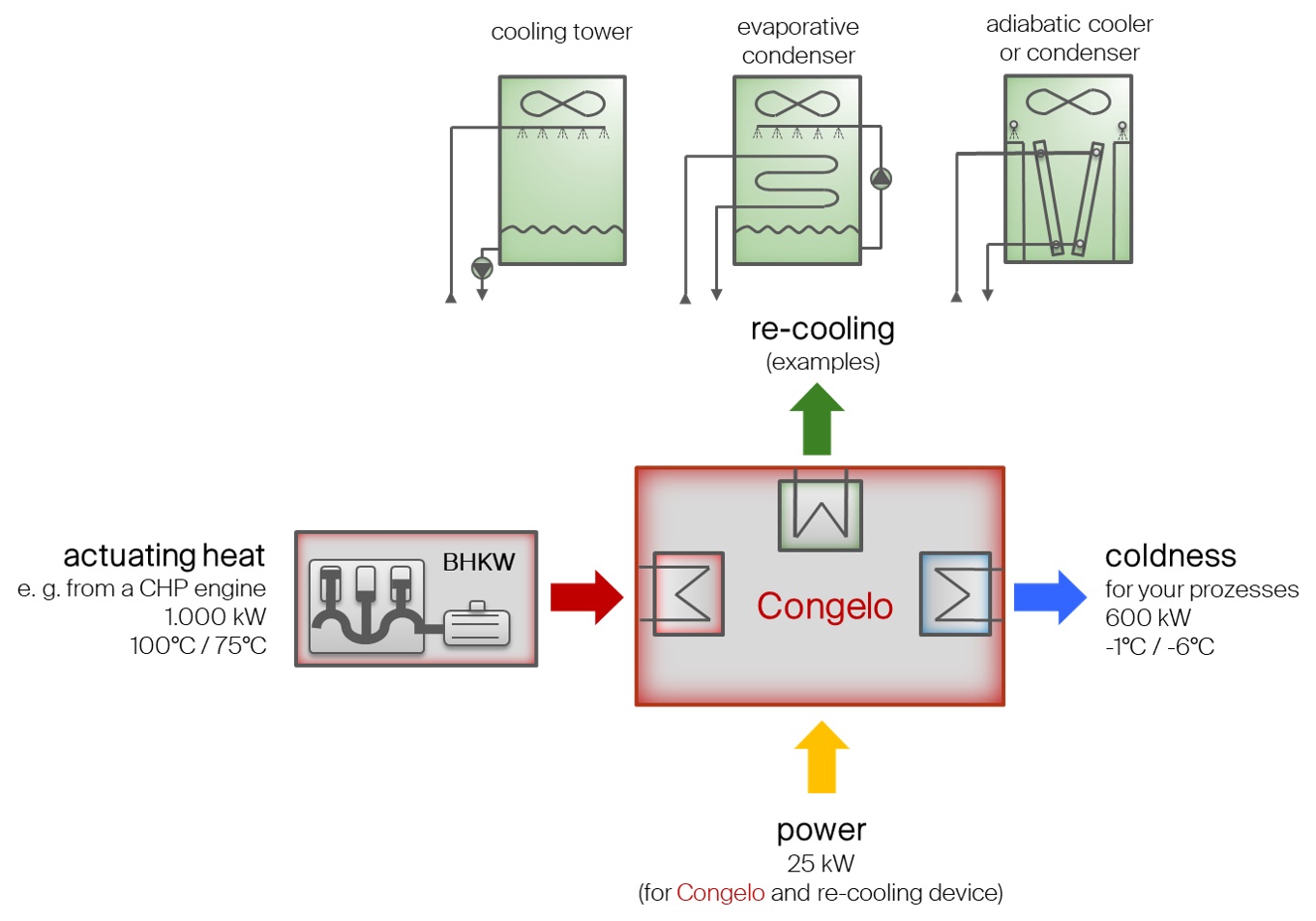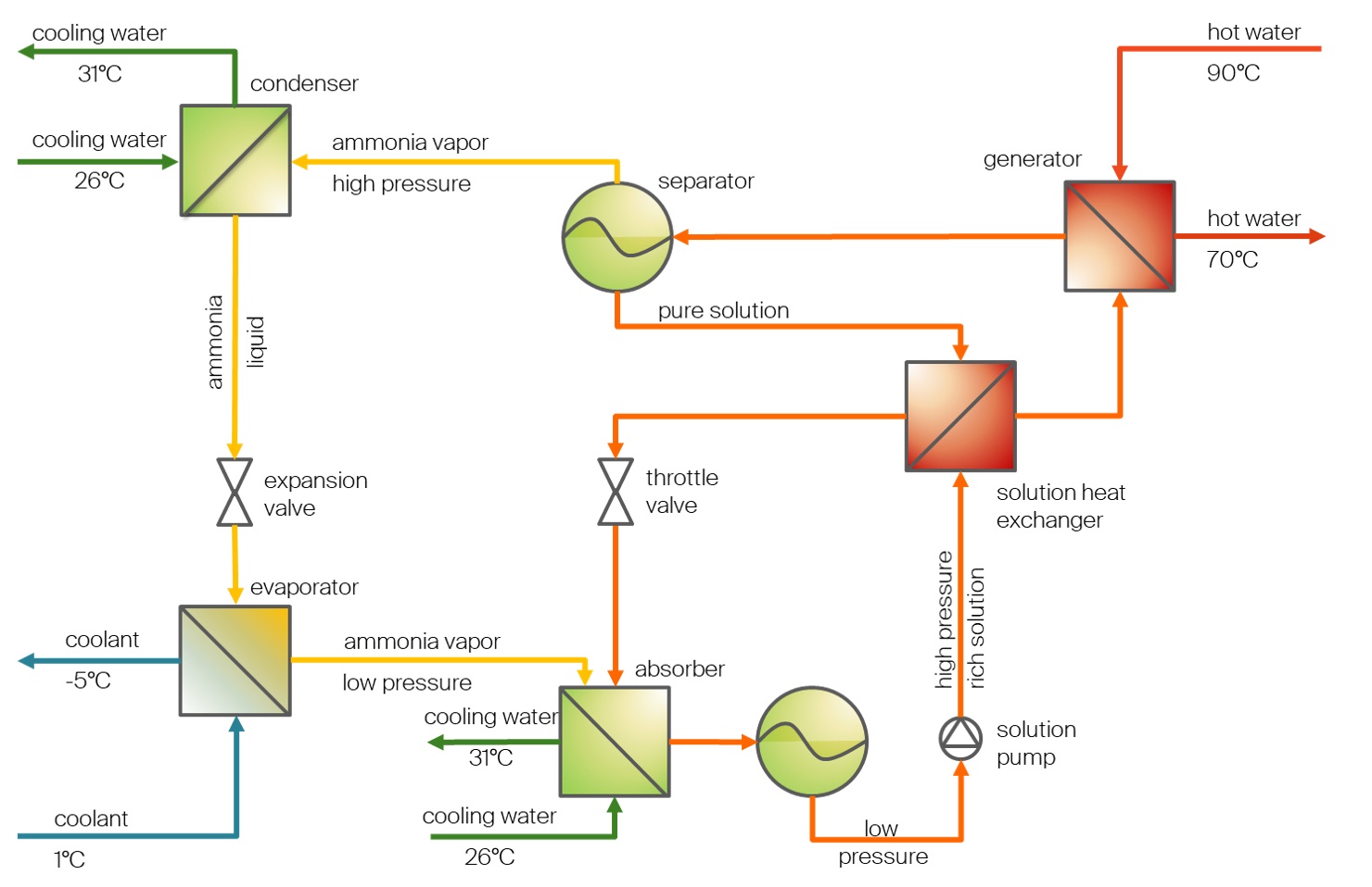 For this purpose, the rich solution is first preheated in a solution heat exchanger by means of internal heat recovery and is then transferred to the generator. The actual actuating energy of the plant is fed into this generator. With the actuating heat, which for example comes from a CHP plant, the temperature of the solution is increased until the ammonia evaporates again. In the separator, the vaporous ammonia separates from the then ammonia-poor solution flowing upwards to the cooling part of the absorption chiller.
