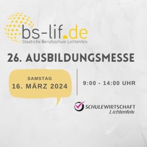 Am 29.03.2025 sind wir auf der 27. Ausbildungsmesse in der Berufsschule Lichtenfels vertreten. Unser Stand befindet sich auf Ebene 2 ...