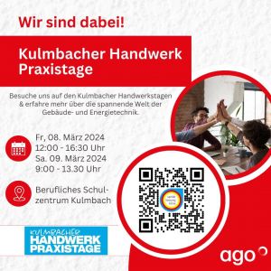 Wir sind dabei beim Kulmbacher Pilotprojekt! Am 17.03. und 18.03. werden wir gemeinsam mit anderen Kulmbacher Handwerksunternehmen den Kulmbacher Schülerinnen ...