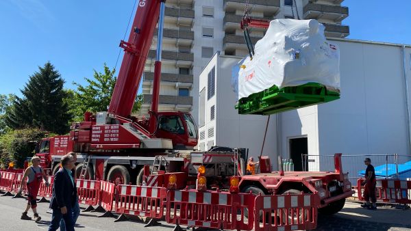 Der Bau der Anlage schreitet voran und jetzt wurde der BHWK-Motor in Stein angeliefert und installiert.
