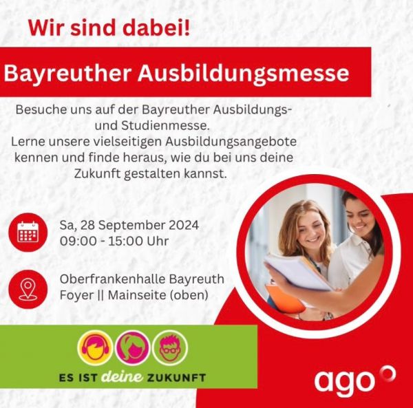 Am Samstag, den 28.09.2024, habt ihr die Gelegenheit, uns auf der Bayreuther Ausbildungs- und Studienmesse zu treffen!