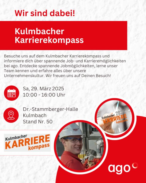 Am Samstag, den 29. März, findet der Karrierekompass Kulmbach in der Stadthalle Kulmbach statt – und wir von AGO GmbH Energie + Anlagen sind mit dabei!