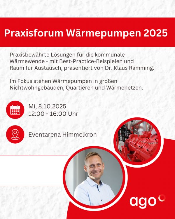 Dr. Klaus Ramming von der AGO GmbH Energie + Anlagen wird am 08.10.2025 beim Praxisforum Wärmepumpen in der Eventarena Himmelkron einen Vortrag halten.