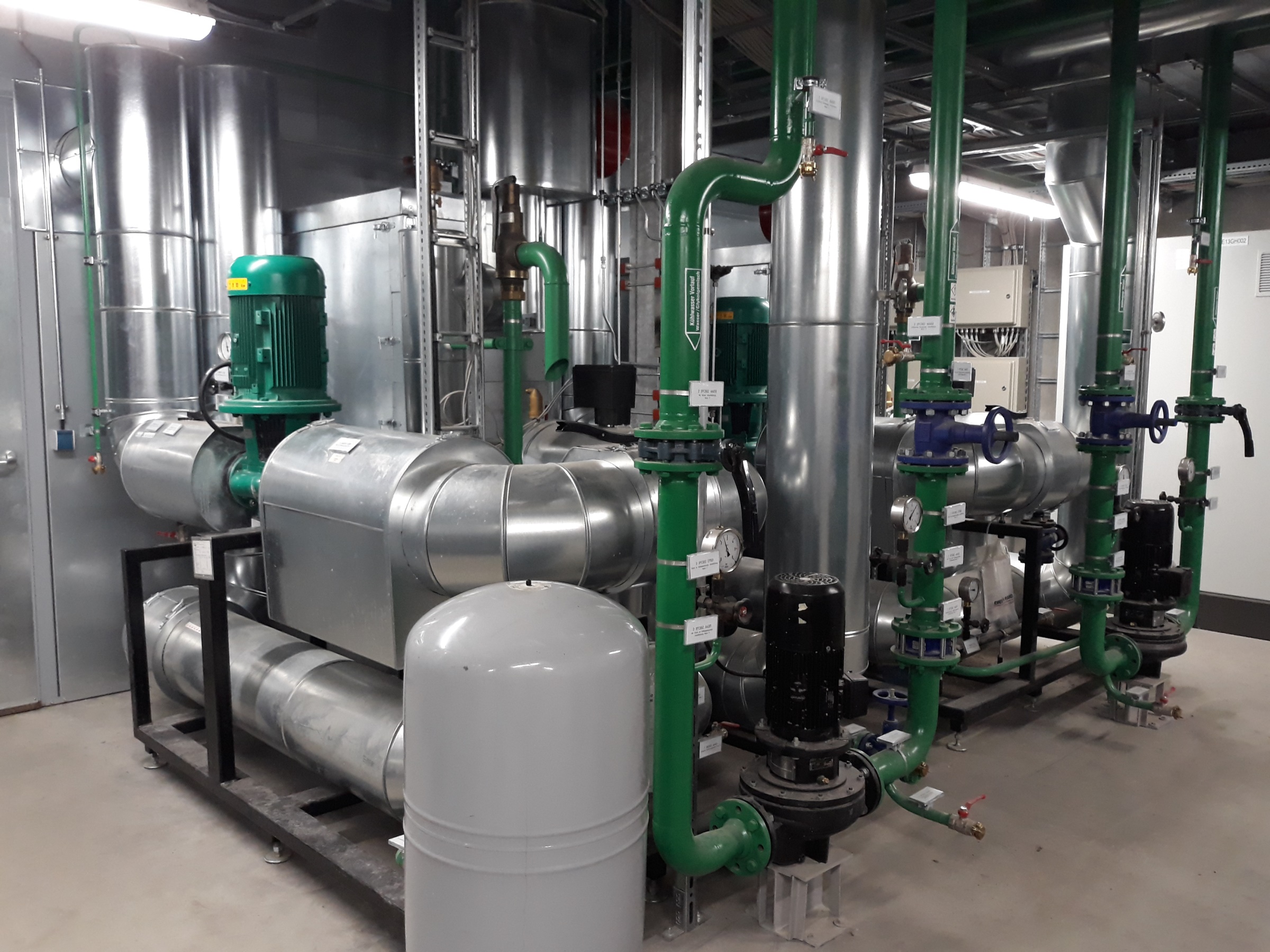Die AGO GmbH realisierte die komplette Anlagentechnik für die Kältezentrale inklusive Erzeugung, Kältespeicher, freier Kühlung, sowie Enthärtungsanlagen für die adiabate Kühlung. Die Heizzentrale besteht aus 4 BHKW-Modulen mit einer elektr. Leistung von jeweils 2.096 kW. Die AGO GmbH vollzog hierfür den gesamten Anlagenbau samt Ersatzdruckhaltung für das Fernwärmenetz.