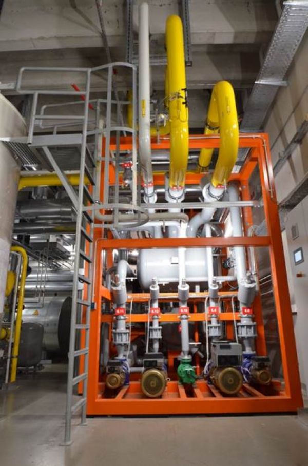 Kraft-Wärme-Kälte-Koppelungsanlage bestehend aus einem BHKW, einem Abhitzekessel und der Absorptionskältemaschine ago congelo® zur Versorgung der Produktionsstätte in Kemnath mit Strom, Dampf, Wärme und Kälte.